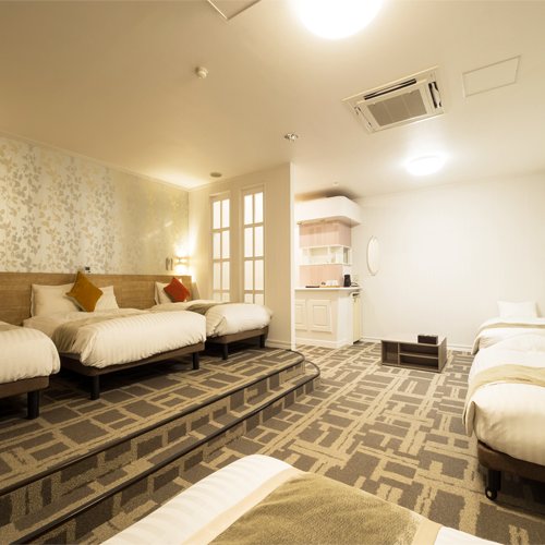 全室広いめの設計になっており、23平米のシングルのお部屋、25平米のツインのお部屋、そして最上階スイートルームはなんと60平米の最大8名様が泊まれるとても広いお部屋です。こちらが最上階のスウィートルームでございます。